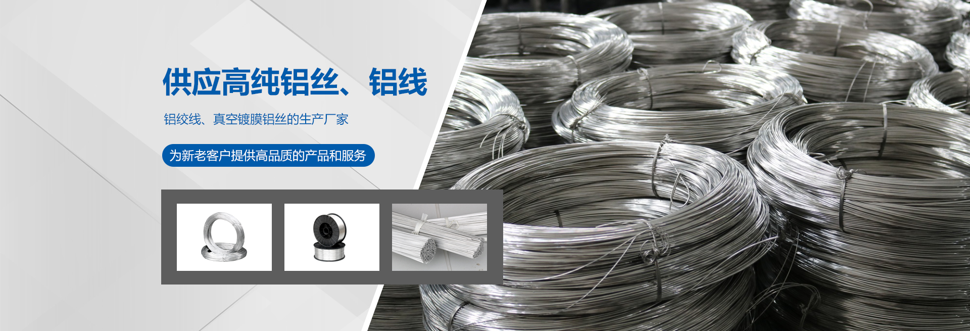 高純度鋁絲:公司主打產品。SGS認證產品,適用于真空鍍鋁。純度99.9%。可為客戶量身定做生產的各盤裝鋁絲、鋁直條。產品應用領域十分廣泛,如:真空鍍鋁膜、電器儀表、電子、家電業、電線電纜業、建筑裝飾業、五金裝飾業、IT電腦業、廣告裝飾業、醫療器械、工藝制品、防腐制品(大型港口、橋梁、碼頭)、食品包裝容器、紡織服裝等。